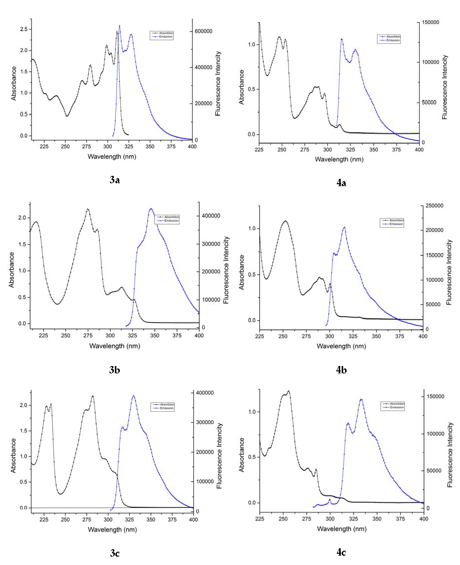 Figure 1. The absorption and emission spectra of benzofuran derivatives 3a–c and 4a–c in cyclohexane.