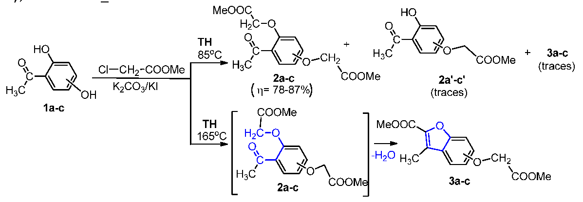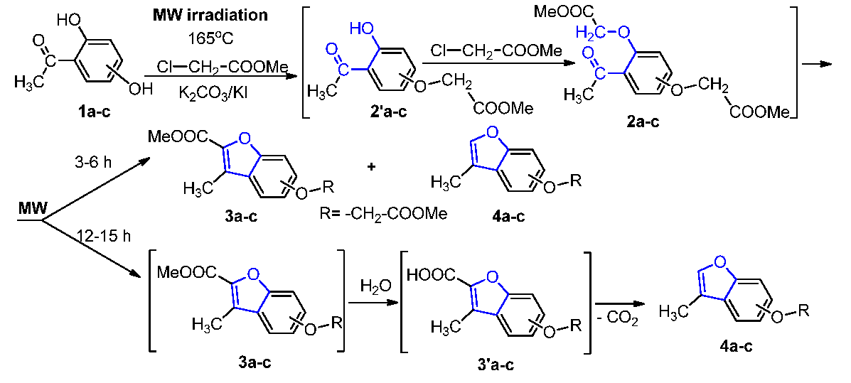 In contrast with conventional TH, when only one type of benzofuran derivative was obtained (3a–c), the MW-assisted reactions led either to a mixture of benzofuran derivatives, 3a–c and 4a–c, or to another type of benzofuran derivative (4a–c), according to the reaction time employed.
