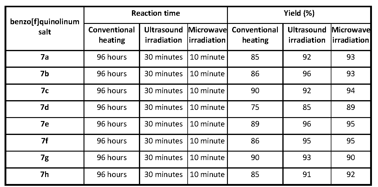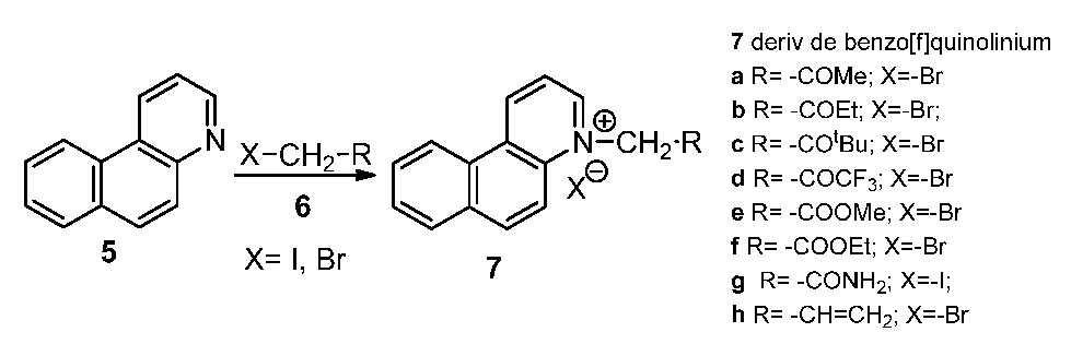 In this stage were synthesized some salts derived from benzo[f]quinoline 7a-h by quaternization reaction with halogenoderivatives with increased reactivity 6 such as haloketone. Benzo[f]quinolinium salts were obtained according to the literature data, using the classical heating sources.