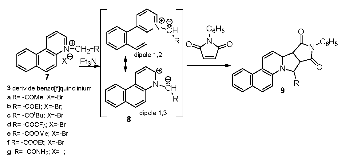 In this stage was investigated the reaction of of benzo[f]quinolinium N-ylides 8 (generated in situ from the corresponding quaternary salts 7) with activated alkenes. Reactions were performed using classical heating methods.
