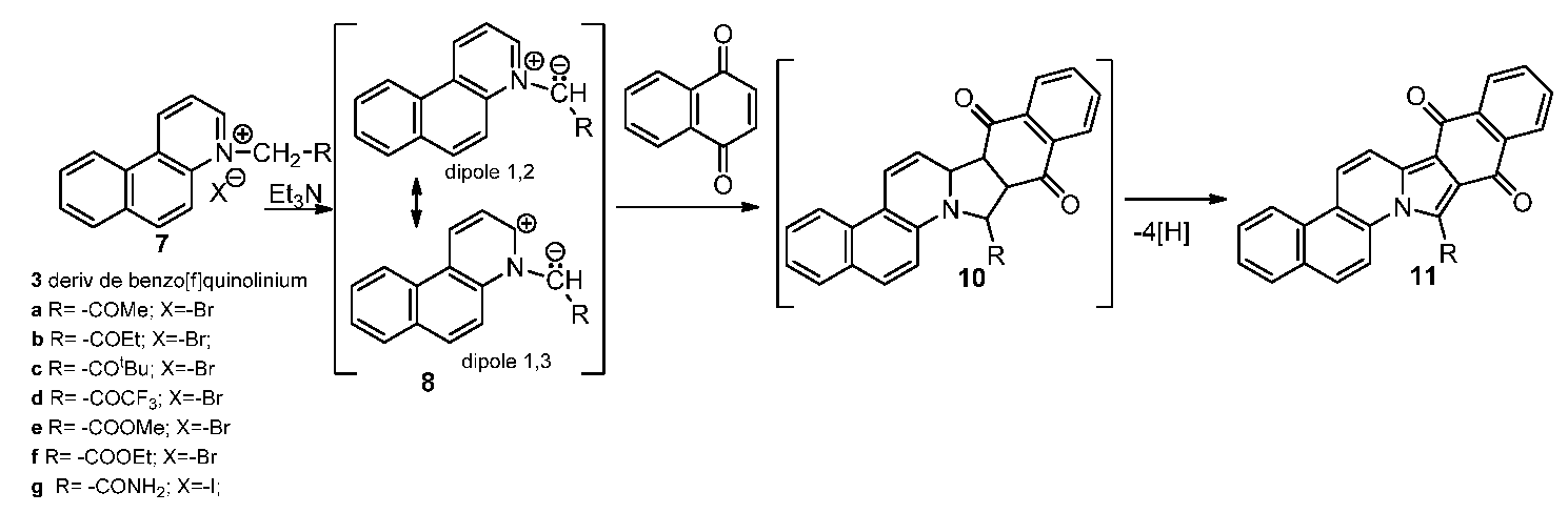 In the case of cycloaddition reaction with naphthoquinone, the tetrahydropyrolic intermediate type 10 was not isolated because it undergoes an oxidative dehydrogenation process and isolating the fully aromatic azasteroidic derivatives type 11.