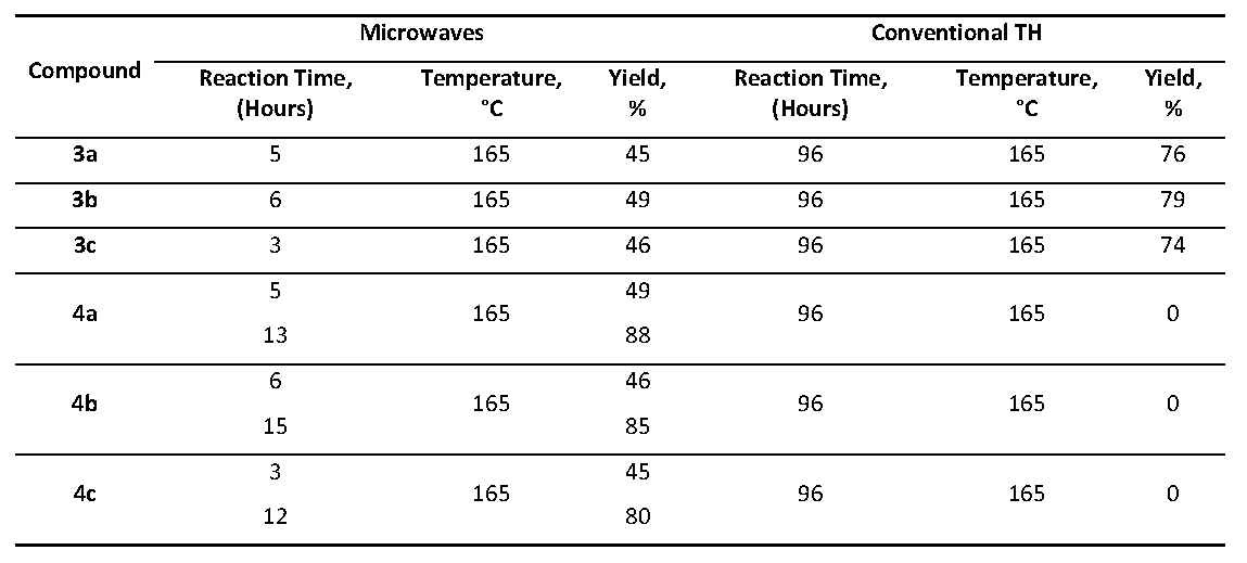 The best conditions used in thermal heating and MW irradiation are presented in Table 1. Under MW irradiation, the optimal reaction conditions were found to be at 165 °C, 17–19 bars.